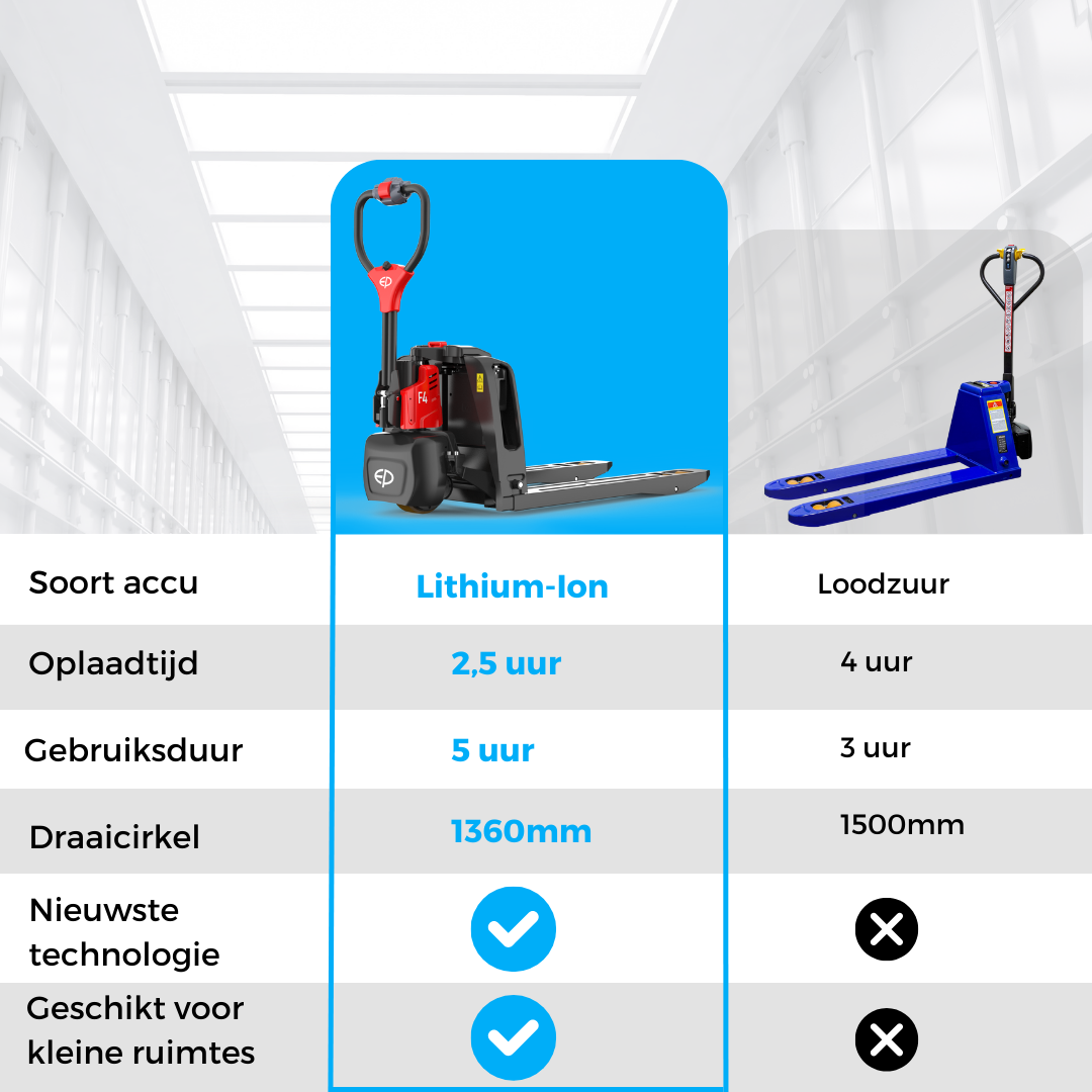 Wil je jouw interne transport optimaliseren? Kies dan voor de innovatieve en krachtige F4 elektrische palletwagen van EP. Bestel vandaag nog en ervaar de voordelen van duurzaamheid en efficiëntie! Heb je vragen of behoefte aan advies op maat? Neem gerust contact met ons op of lees een van onze informatieve blogs!