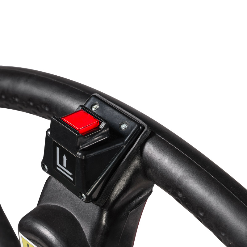 Deze schaarpalletwagen is meer dan alleen een handpalletwagen. Hij fungeert ook als heftafel of werkbank. Het rubberen handvat is uitgerust met een pomp- en stuurhefboom met drie standen: heffen, neutraal en dalen. De ergonomisch gevormde greep maakt het eenvoudig om het heffen, rijden en dalen te regelen, wat de algehele gebruikservaring verbetert.
